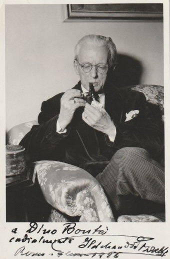 La lettera è impreziosita dalla firma autografa di Eugène Tisserant (1884–1972), una delle figure più importanti della cultura ecclesiastica del Novecento. Cardinale, orientalista e grande studioso delle lingue semitiche, Tisserant ricoprì incarichi di grande prestigio nella Curia romana, tra cui la direzione della Biblioteca Apostolica Vaticana e successivamente il ruolo di Decano del Collegio Cardinalizio.