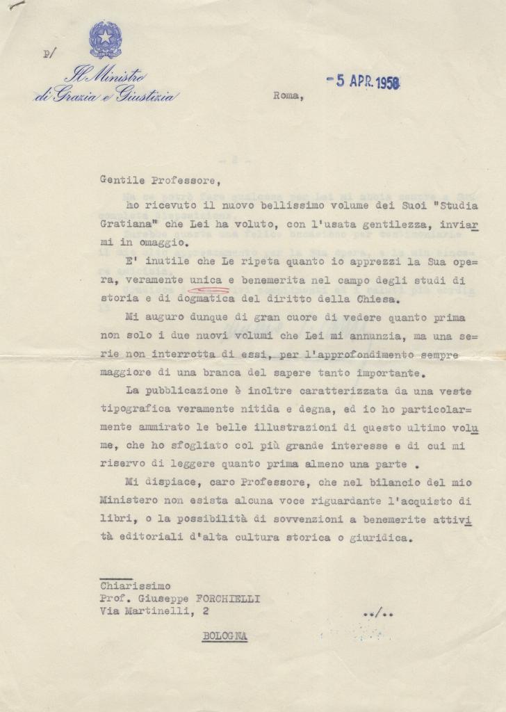 Nella missiva, indirizzata al prof. Giuseppe Forchielli di Bologna, Gonella ringrazia il destinatario per l’invio del volume "Studia Gratiana", esprimendo vivo apprezzamento per l’opera, definita di grande valore nel campo degli studi storici e della dogmatica del diritto della Chiesa.