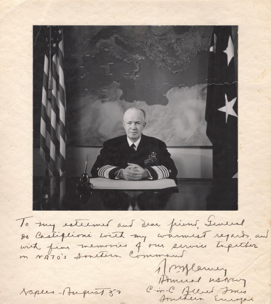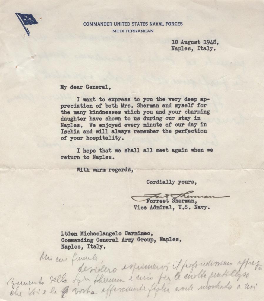 Lettera dattiloscritta firmata dal Vice Ammiraglio Forrest Sherman (U.S. Navy), redatta su carta intestata del Commander United States Naval Forces – Mediterranean, a Napoli il 10 agosto 1949, indirizzata al Generale Carmineo, comandante del Comando Militare Territoriale di Napoli. Il documento inoltre presenta annotazioni manoscritte a matita, costituenti una traduzione italiana del contenuto.