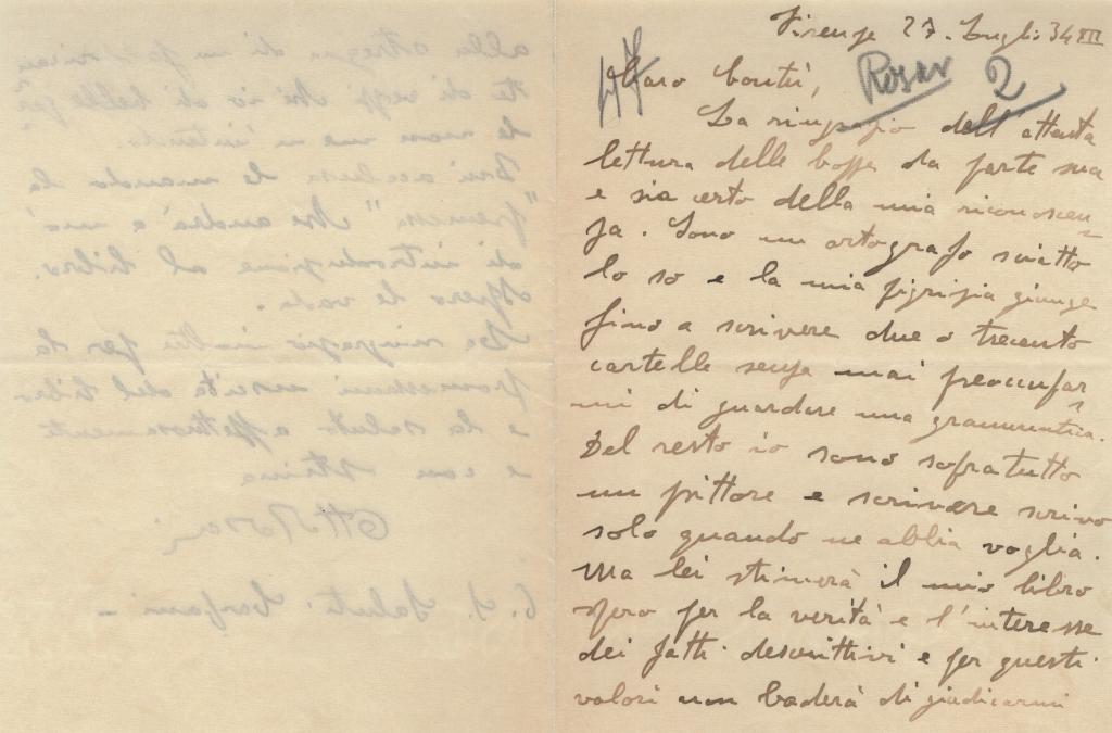 Lettera interamente autografa di Ottone Rosai, redatta a Firenze il 27 luglio 1934, in cui il pittore esprime sincera riconoscenza per l’attenta lettura della bozza del suo lavoro, mostrando apprezzamento per l’interesse dimostrato dal destinatario.