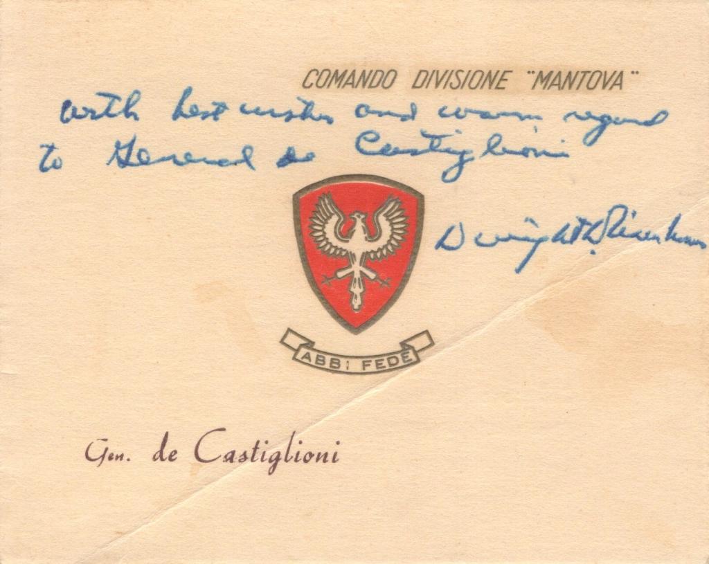 - Biglietto con intestazione del “Comando Divisione Mantova”, recante una breve annotazione autografa di carattere augurale indirizzata al generale de Castiglioni. Si tratta di un invito ufficiale a colazione in onore del Generale Eisenhower, tenutasi presso il Circolo Ufficiali del Presidio di Udine il 5 maggio 1952. Il menù riporta pietanze e vini selezionati, tipici di occasioni di rappresentanza.