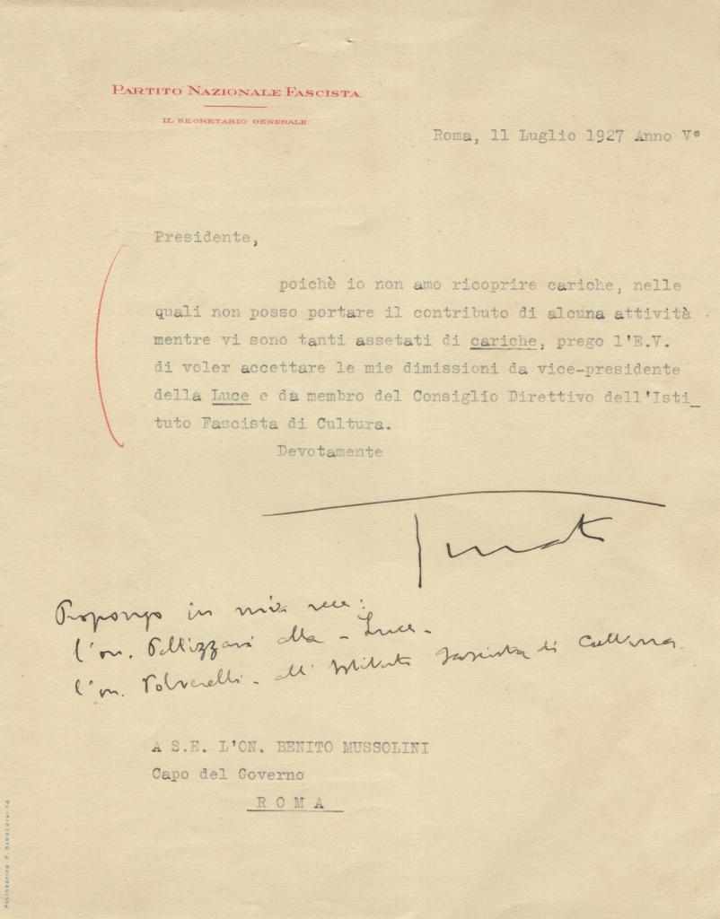 La prima lettera, firmata da Francesco Giunta, è indirizzata all’On. Giuseppe Bottai, allora Ministro delle Corporazioni.
