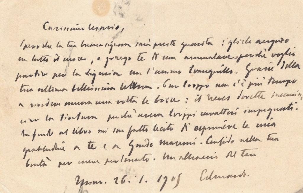 Nel contenuto Graziani si rivolge in tono confidenziale al destinatario (“mio caro Cesare”), ringraziandolo per il vivo interessamento verso la sua salute. Dichiara di aver sofferto molto e di soffrire ancora, ma rassicura che le notizie diffuse dalla stampa risultano amplificate ed esagerate, ridimensionando quindi le voci circolanti sulle sue condizioni.