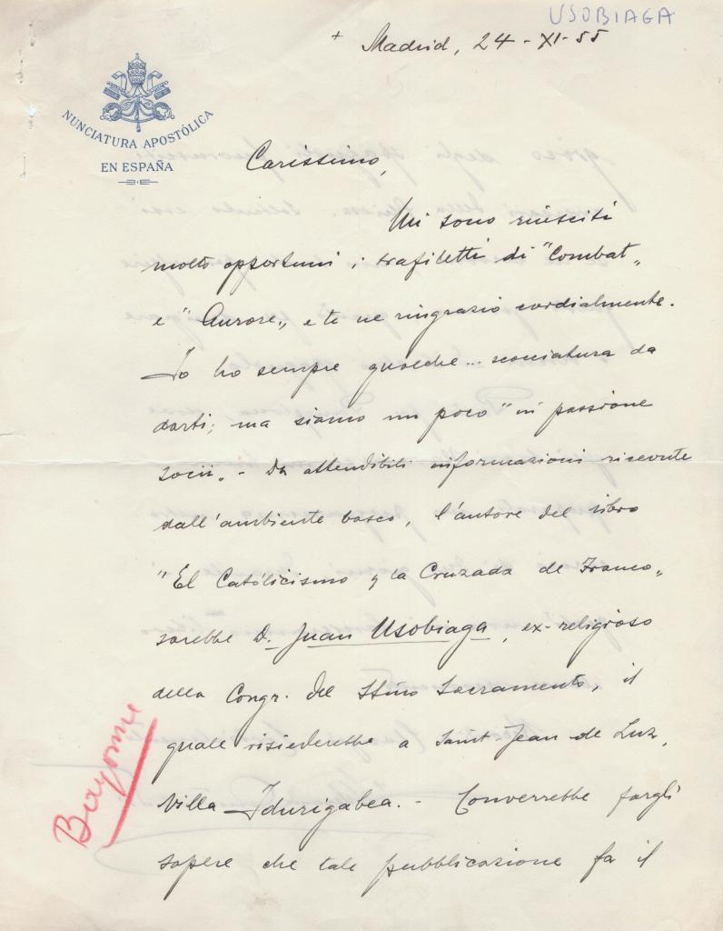 Egli attribuisce la paternità del volume “El catolicismo y la cruzada de Franco” a Juan Usobiaga, indicato come ex religioso della Congregazione del Santissimo Sacramento, residente a Saint-Jean-de-Luz.