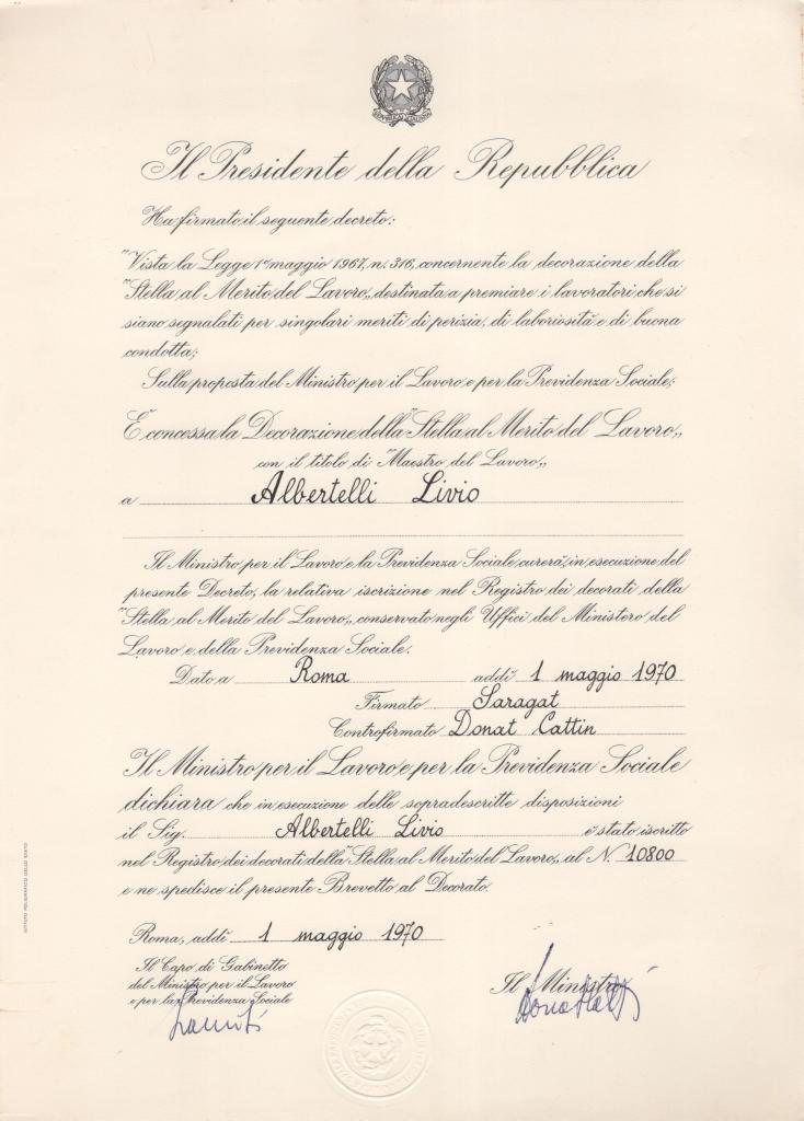 Il documento, con intestazione “Il Presidente della Repubblica” e stemma repubblicano, sancisce, ai sensi della legge 5 maggio 1967 n. 316, l’attribuzione della distinzione onorifica con il titolo di “Maestro del Lavoro” al Sig. Albertelli Livio, per meriti di perizia, laboriosità e condotta.