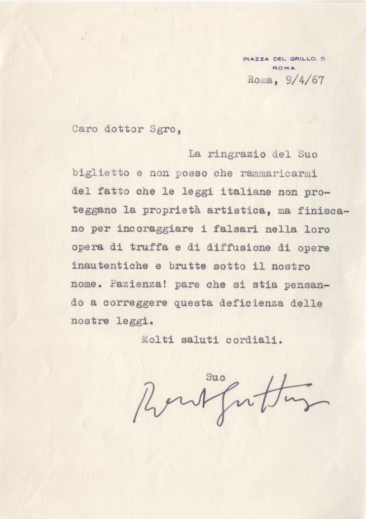 Lettera dattiloscritta con firma del pittore Renato Guttuso su carta intestata “Piazza del Grillo, 5 – Roma”, indirizzata al dottor Sgro, datata 9 luglio 1967.