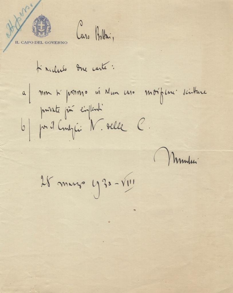Interessante coppia di lettere datate Roma, 16 e 18 novembre 1931, redatte su carta intestata della Presidenza del Consiglio dei Ministri – Sottosegretariato di Stato e del Ministero delle Corporazioni.