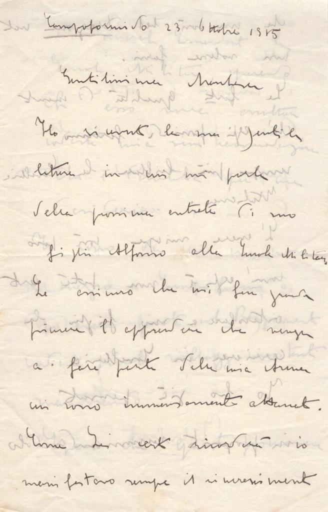 Lettera interamente autografa di Filiberto di Savoia indirizzata a una Marchesa, nella quale il duca si congratula per la scelta del figlio Alfonso di intraprendere la carriera militare ed entrare nella Scuola Militare.Il documento è datato “Campoformio, 23 ottobre 1915” e lo stesso autore informa che rimarrà presso il reggimento per circa un mese e mezzo.