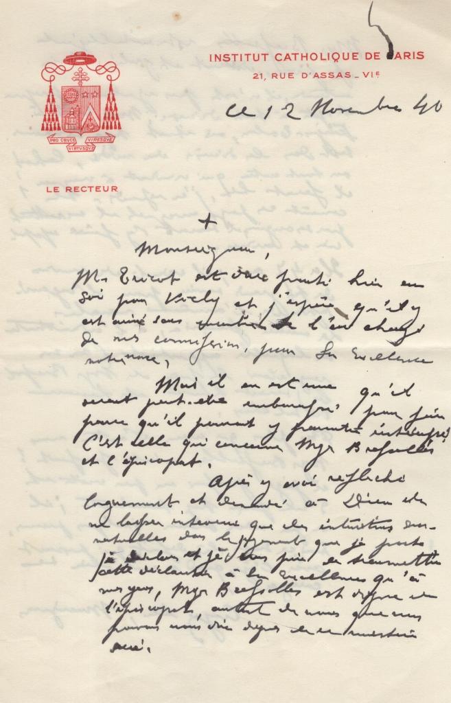 Lettera interamente autografa di Alfred Baudrillart, Cardinale e Rettore dell'Istituto cattolico di Parigi, su carta intestata “Institut Catholique de Paris – Le Recteur”, datata “ce 12 novembre 40”.