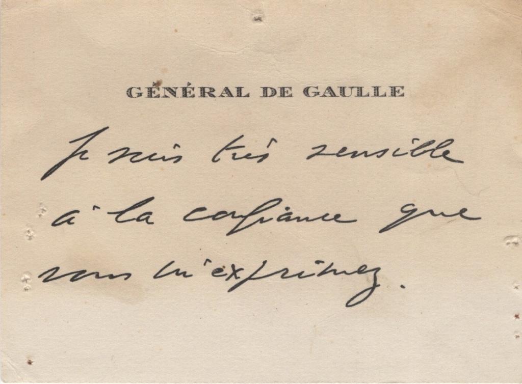 Il biglietto, non datato, è riferibile al novembre 1965 proprio in base ai timbri postali presenti sulla busta. Reca una breve nota manoscritta del Generale de Gaulle, vergata in inchiostro scuro, con il testo: