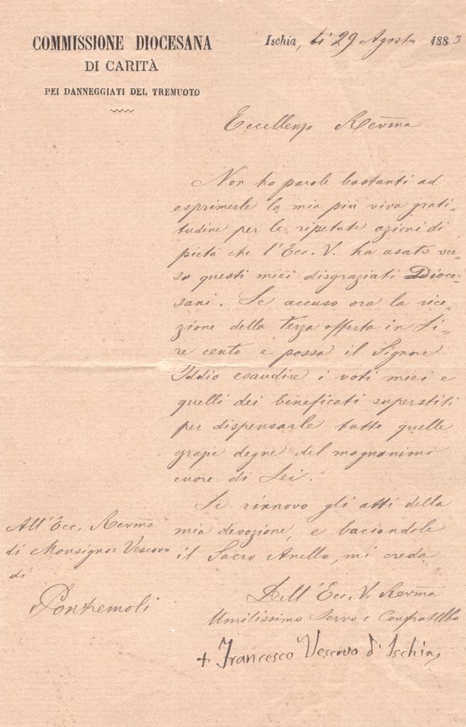 Lettera con autografo di Francesco Di Nicola, vescovo di Ischia, redatta su carta intestata della “Commissione Diocesana di Carità per i danneggiati del tremuoto”, istituita a seguito del devastante terremoto che colpì l’isola di Ischia nell’agosto del 1883.