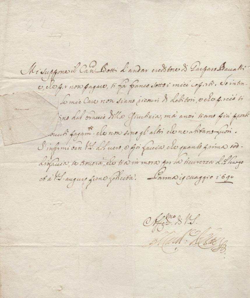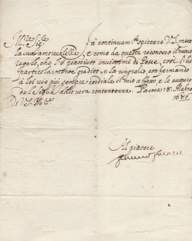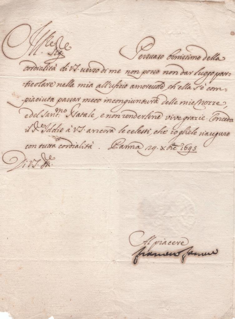 Lettera manoscritta con autografo di Francesco Farnese, Duca di Parma e Piacenza. Il documento datato Parma, 29 dicembre 1695 è steso su carta vergata di area toscana con filigrana medicea, elemento di particolare pregio e non comune per la cancelleria parmense.