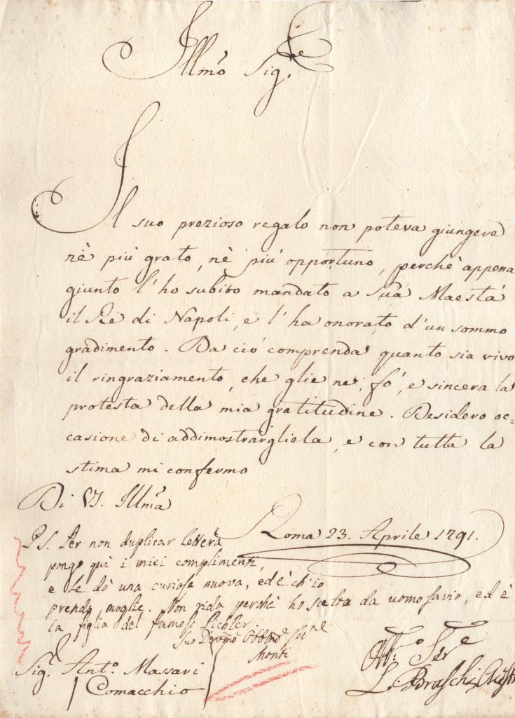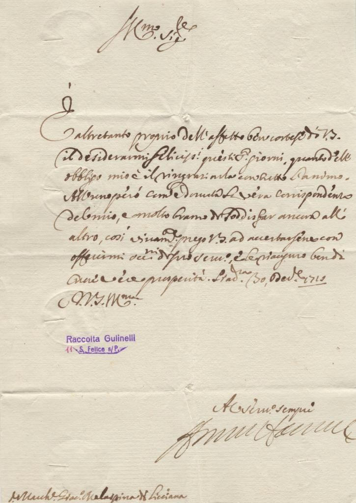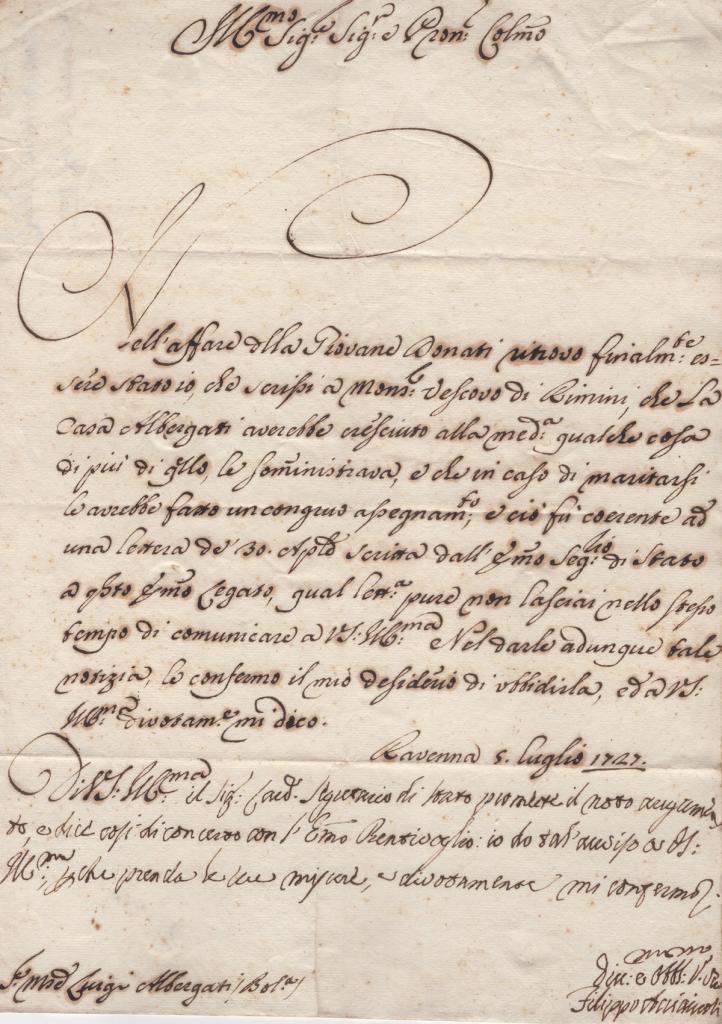 Lettera manoscritta con autografo del futuro Cardinale Filippo Acciaiuoli, allora vice legato pontificio a Ravenna, redatta a Ravenna il 5 luglio 1727.