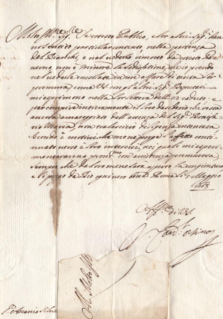 Lettera manoscritta con autografo del Cardinale Virginio Orsini, redatta a Roma il 5 maggio 1663 e indirizzata al Governatore di Cingoli, Ascanio Silvestri. Al verso è presente un sigillo in ceralacca perfettamente conservato.