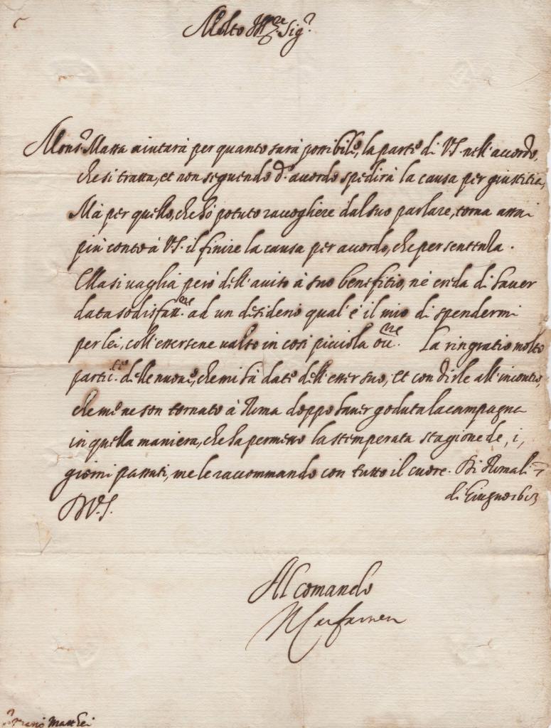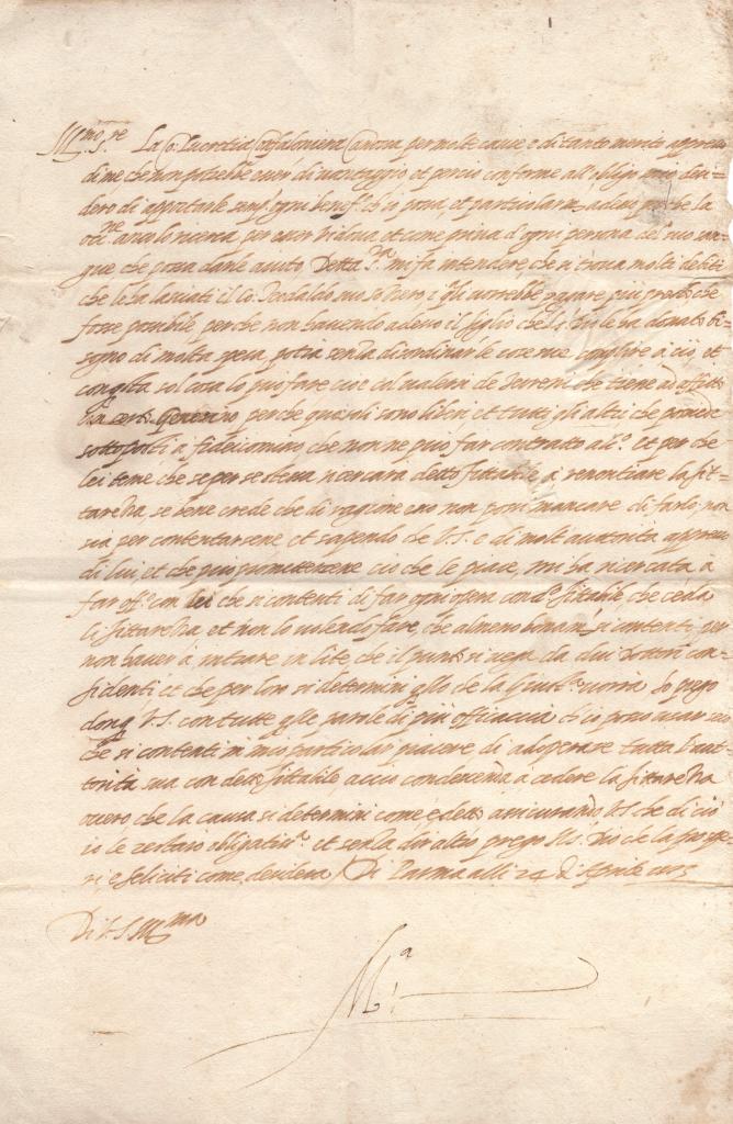 Nel testo della missiva Odoardo Farnese comunica al destinatario che Monsignor Massa si adopererà per assisterlo nella questione in oggetto, lasciando intendere un intervento volto a favorire una soluzione positiva. La lettera assume quindi un carattere di raccomandazione e sostegno. Nella parte finale il cardinale aggiunge un passaggio più personale, ricordando con piacere il tempo trascorso in campagna e l’incontro avuto con il destinatario, esprimendo un tono cordiale e benevolo.