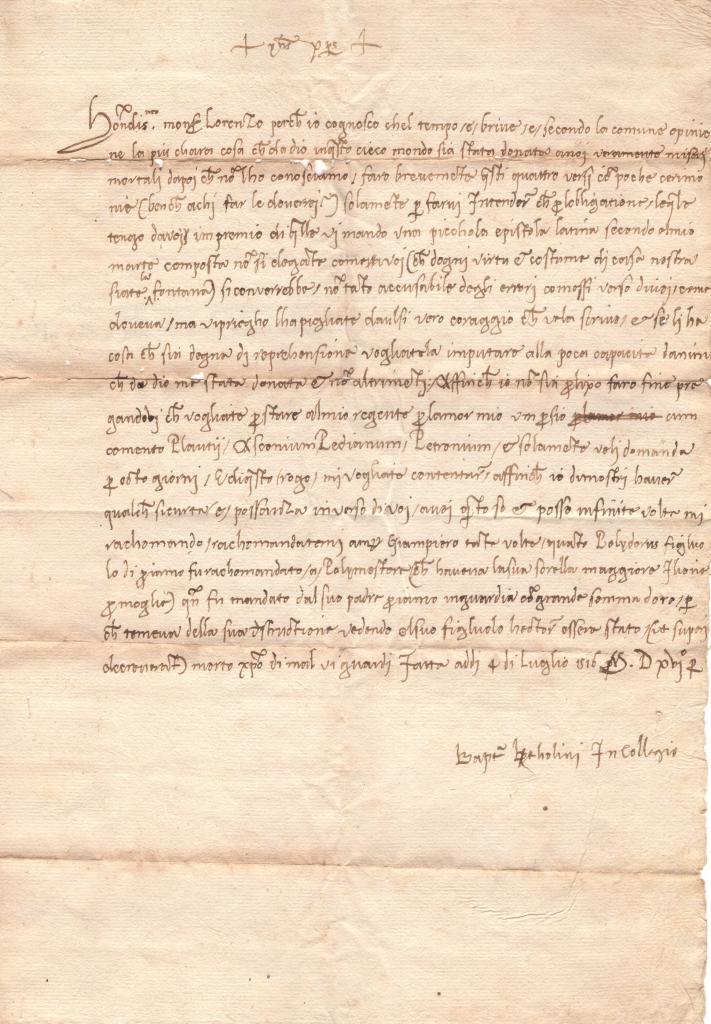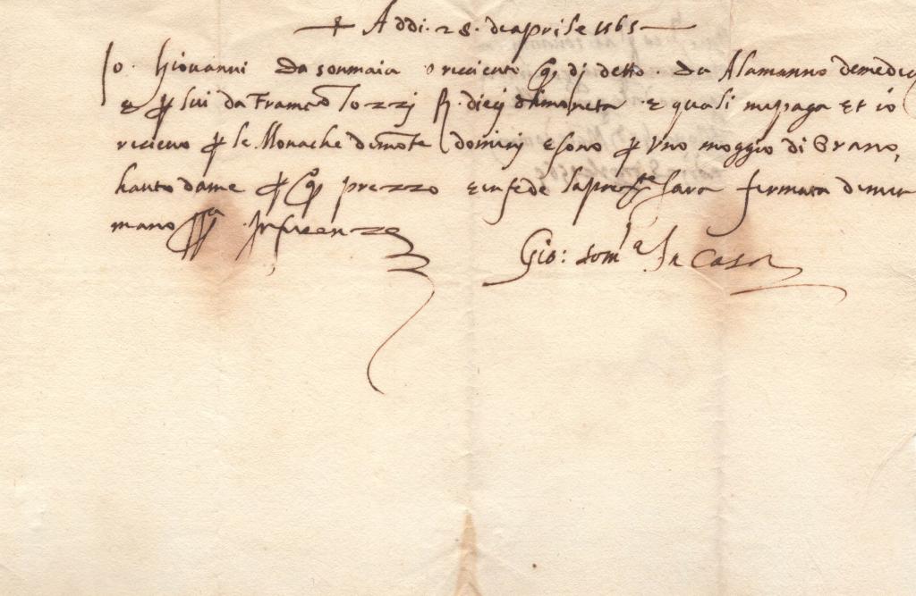Ricevuta di pagamento interamente autografa di Giovanni da Sommaia, padre del celebre giurista Girolamo da Sommaia, redatta l’8 aprile 1565 dalla villa di Sommaia, presso Firenze.