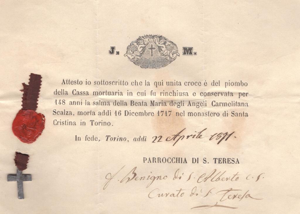 Nell'attestazione si afferma che la croce e il piombo furono uniti alla cassa mortuaria contenente la salma della Beata Maria degli Angeli Carmelitana Scalza, conservata per 148 anni nel monastero torinese. Viene inoltre indicata la data della morte, 16 dicembre 1717, e la successiva attestazione ecclesiastica redatta in fede a Torino il 22 aprile 1947, con firma autografa del parroco.