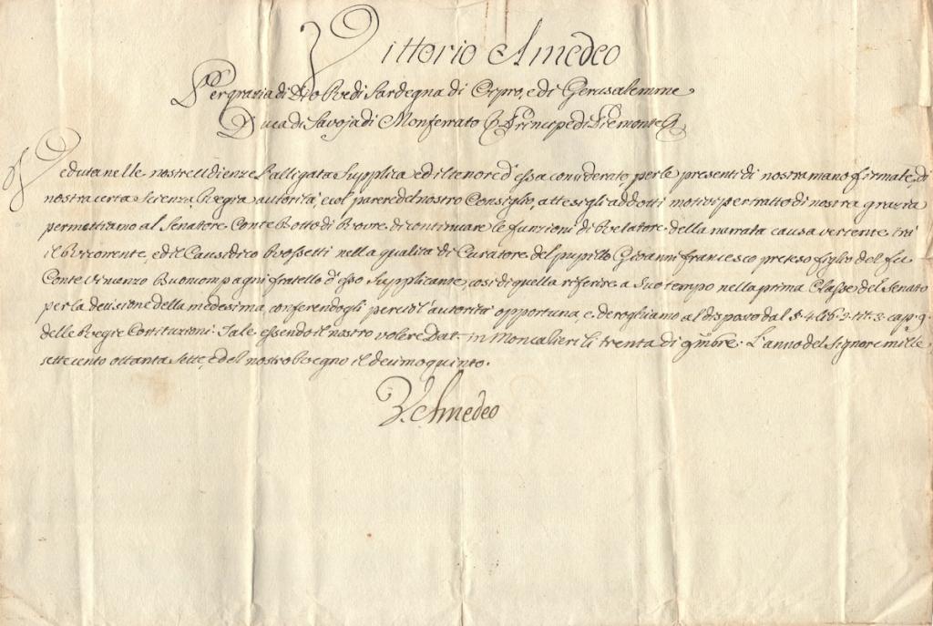 Nel testo la Duchessa esprime gratitudine per le notizie comunicate, facendo riferimento alla loro novità e rilevanza, e prende atto del desiderio manifestato dal destinatario di fermarsi ad Ivrea. Accenna inoltre a un’offerta precedentemente segnalata, trasmettendo con la presente l’avviso di Sua Maestà in merito. La Duchessa manifesta infine rammarico per le condizioni di salute del Maresciallo, sottolineando le sofferenze che lo affliggono.