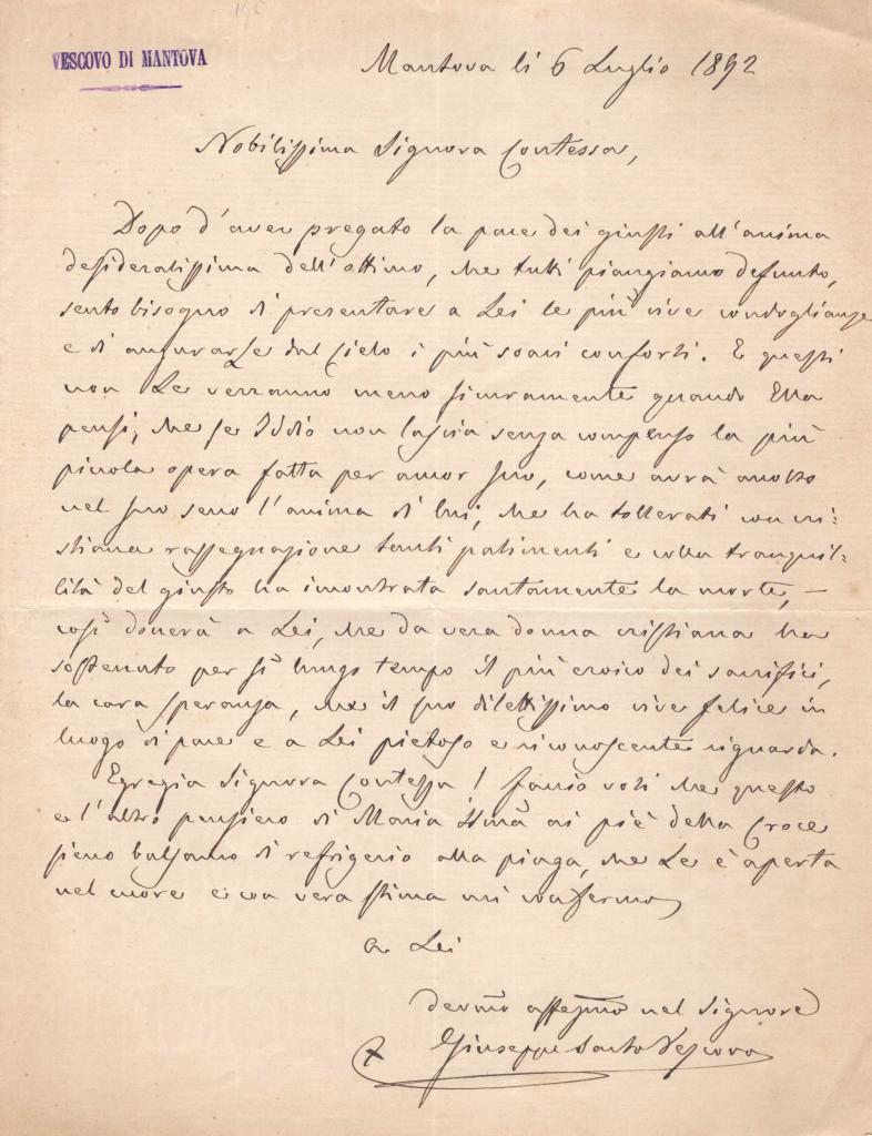 Lettera manoscritta con autografo di Giuseppe Sarto, Vescovo di Mantova e futuro Papa Pio X, redatta a Mantova il 6 luglio 1892, indirizzata a una contessa. Documento interamente autografo, su carta intestata “Vescovo di Mantova”.