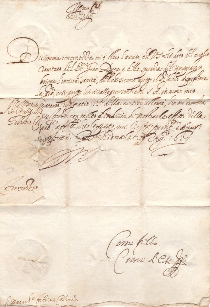 Nella missiva il Duca manifesta viva attenzione per le condizioni del “Serenissimo Gran Duca”, identificabile in Cosimo II de’ Medici, chiedendo aggiornamenti circa il suo stato di salute. Il riferimento alla malattia – con ogni probabilità la gotta, di cui Cosimo II soffriva – assume particolare rilievo storico, considerando che il granduca sarebbe scomparso pochi anni dopo (1621).