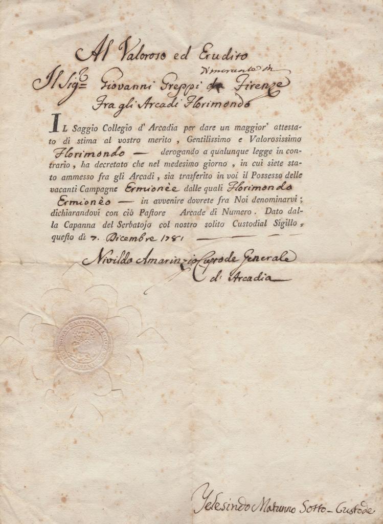Pergamena manoscritta con autografi del Cardinale Niccolò Maria Antonelli e del vescovo di Modena Giuseppe Maria Fogliani, redatta a Roma il 1° marzo 1765, con intestazione pontificia “CLEMENS PP. XIII”, indirizzata alla nobile famiglia Munarini di Modena.