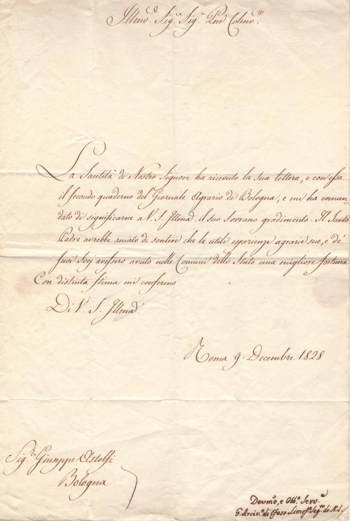 Nella missiva l’Arcivescovo comunica che “la Santità di Nostro Signore” Papa Leone XII ha ricevuto la lettera e il secondo quaderno del “Giornale Agrario di Bologna”, precedentemente inviati dal destinatario.Papa Leone XII esprime il “sovrano gradimento” per il contenuto dell’opera, con particolare apprezzamento per le esperienze agrarie illustrate e per la loro utilità nelle comunità dello Stato.