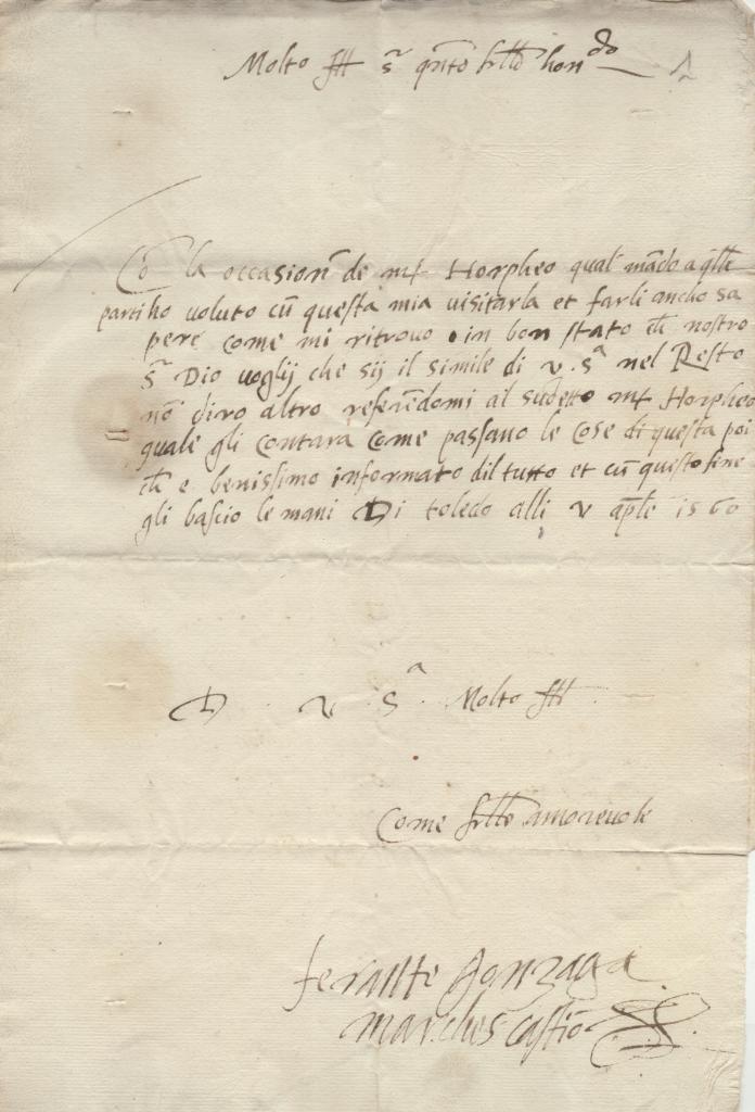 Lettera manoscritta con autografo di Ferrante Gonzaga, marchese di Castiglione, redatta a Toledo (Spagna) il 5 aprile 1560 e indirizzata al Conte Gambara.