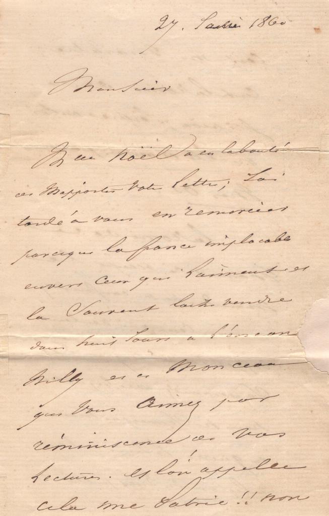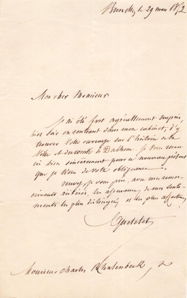 Nel testo Quetelet ringrazia il destinatario per l’invio di un’opera dedicata alla storia della città e contea di Dalhem, esprimendo sorpresa e vivo apprezzamento per il dono ricevuto nel proprio studio. La lettera si configura come una comunicazione di ringraziamento elegante e formale, tipica degli scambi tra uomini di scienza e studiosi nella metà dell’Ottocento.