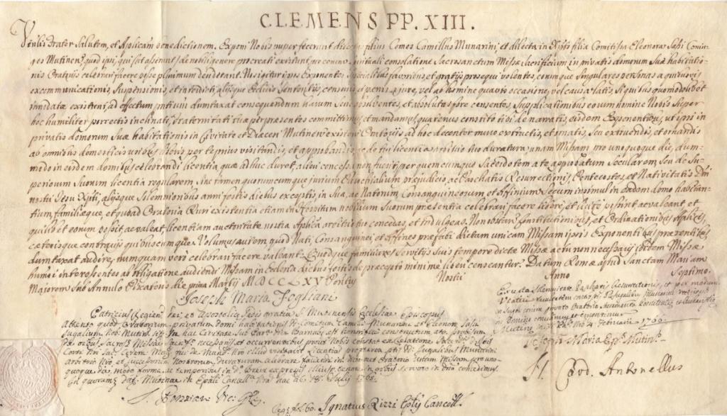 Il documento, di carattere ufficiale e redatto in latino secondo la prassi curiale settecentesca, costituisce un atto di concessione ecclesiastica: con esso si autorizza la famiglia Munarini a erigere e utilizzare una cappella privata all’interno della propria dimora, con facoltà di celebrazione liturgica. Viene inoltre indicato il sacerdote Giovanni Maria Mutini quale officiate autorizzato.
