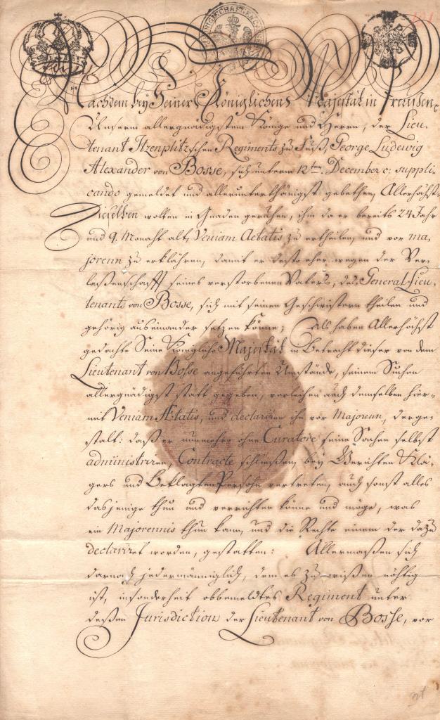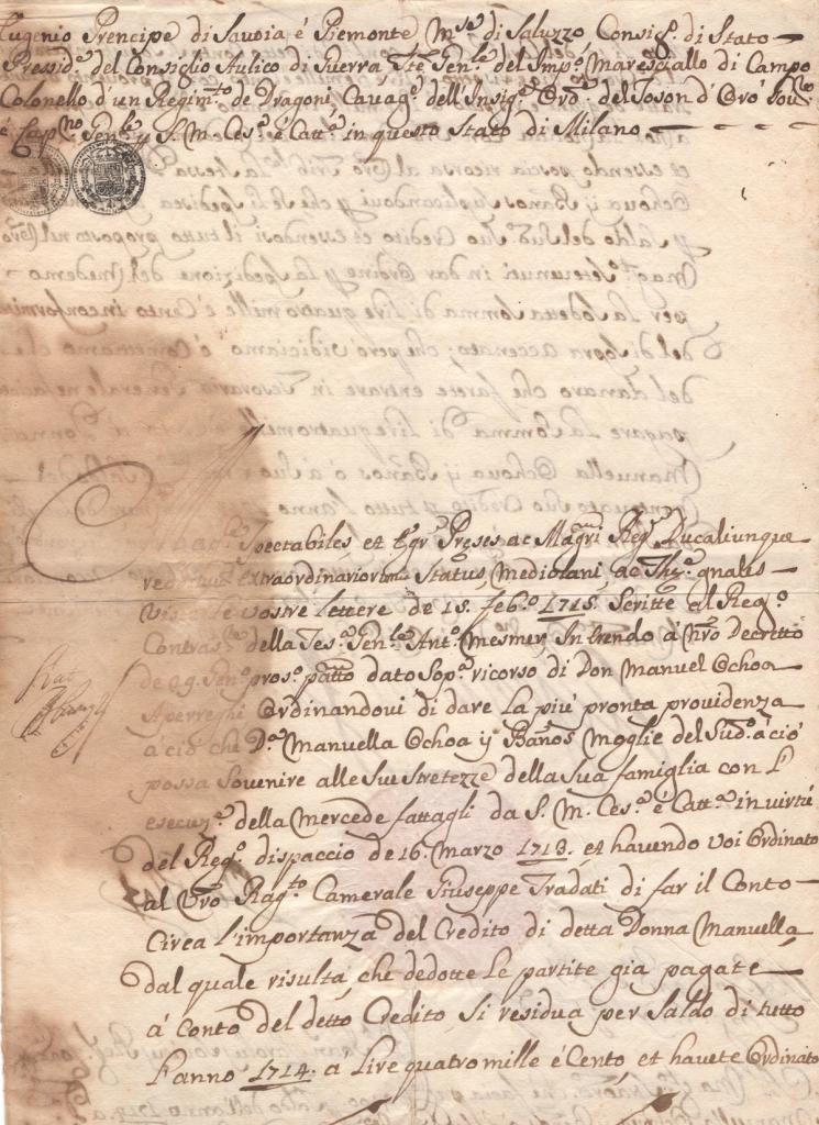 Documento con ampia intestazione nobiliare manoscritta che elenca i titoli del Principe, tra cui governatore e capitano generale nello Stato di Milano.