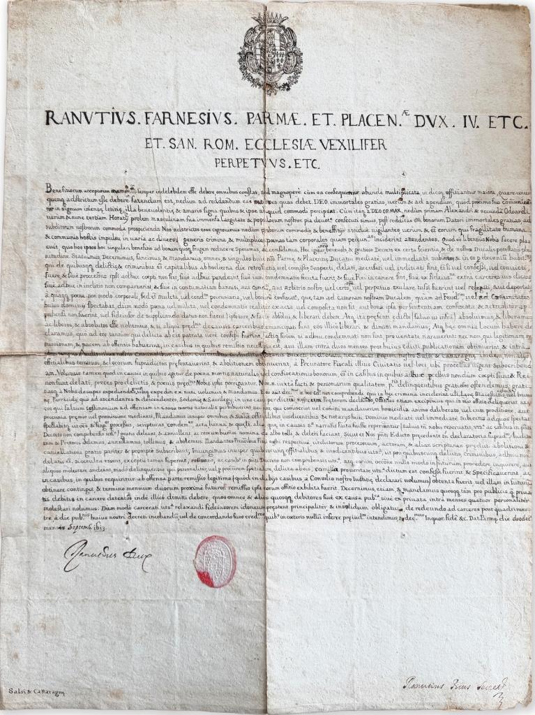 Documento a stampa con integrazioni manoscritte e sottoscrizione autografa di Ranuccio I Farnese duca di Parma e Piacenza. L’atto presenta in apertura l’intestazione tipografica con titolatura completa del duca (“Ranuccius Farnesius Parmae et Placentiae Dux IV…”) sormontata dallo stemma araldico inciso.