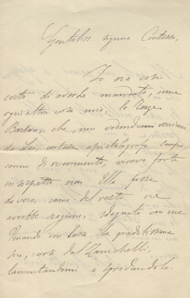 La missiva si configura come lettera di condoglianze, nella quale il Vescovo esprime alla destinataria le più vive e partecipate espressioni di cordoglio per il suo lutto. Il vescovo invita la contessa a trovare conforto nella fede, augurandole “i più soavi conforti” e ricordando come Dio non lasci senza ricompensa nemmeno la più piccola opera compiuta per amor Suo. Sottolinea inoltre la dignità della sofferenza cristiana, riconoscendo nella destinataria una donna che ha saputo sopportare a lungo sacrifici e dolori, e la esorta a confidare nella speranza di "vivere felice in luogo di pace".