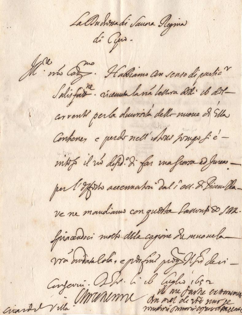 Lettera autografa di Cristina di Francia, Duchessa di Savoia, indirizzata al Marchese Villa, Maresciallo di Campo di S.M.,redatta il 16 luglio 1652, nella quale la sovrana risponde a una precedente missiva ricevuta.