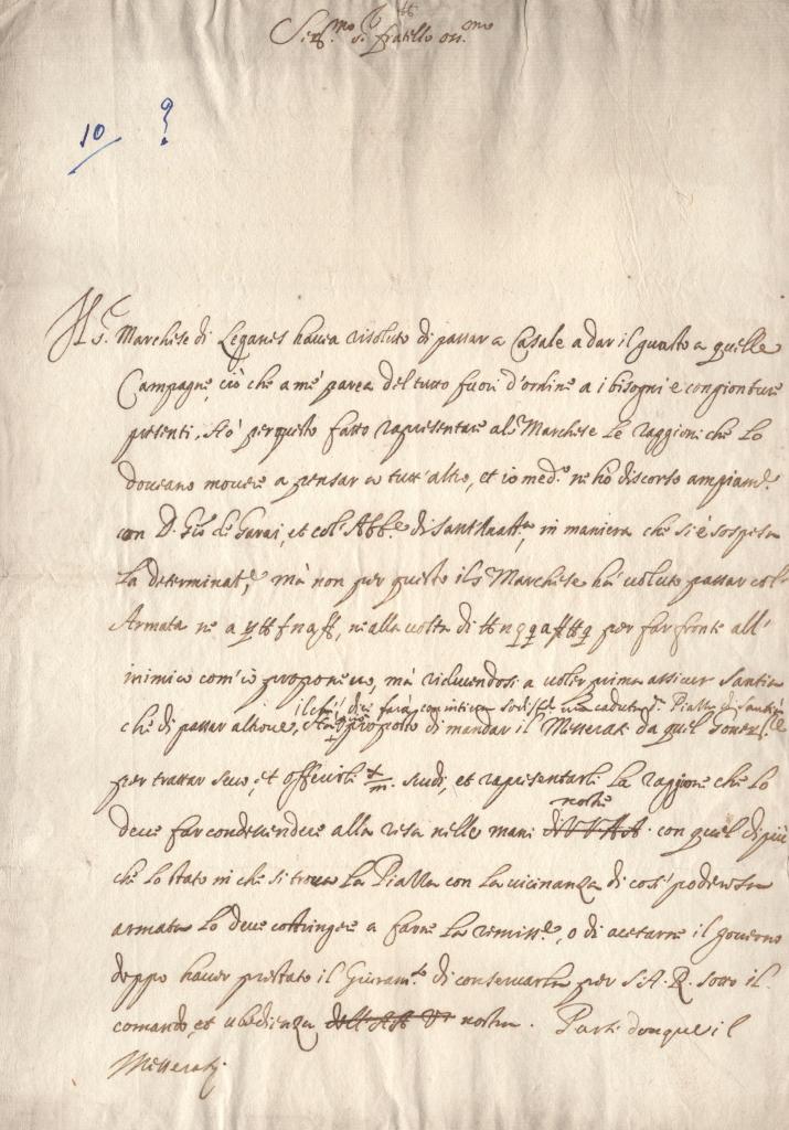 Il documento, di carattere riservato, tratta operazioni militari in Piemonte nel contesto del conflitto tra forze filospagnole e francesi nel Ducato di Savoia. Viene in particolare discusso il comportamento del generale spagnolo Diego Felipe de Guzmán, marchese di Leganés, e le sue iniziative contro le truppe francesi stanziate nel territorio.