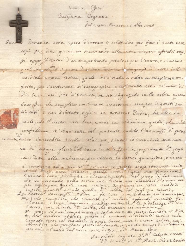 L’oggetto è accompagnato da un nucleo organico di documenti manoscritti di carattere spirituale, tra cui una lettera datata 7 ottobre 1825 (“Dal nostro Monastero”), indirizzata a Modena, e ulteriori fogli contenenti istruzioni dettagliate circa l’acquisizione e l’applicazione delle indulgenze. La corrispondenza è sottoscritta da Suor Celeste Maria Verratti, religiosa attiva in area modenese nella prima metà dell’Ottocento, elemento che consente di collocare con precisione il contesto in ambito monastico femminile di clausura.