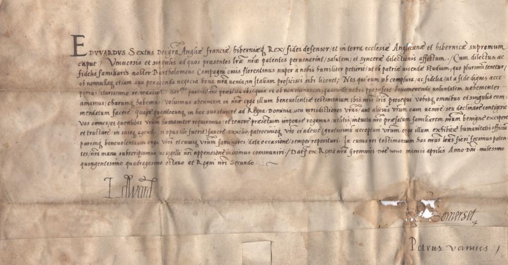 Lettera patente manoscritta con autografo di Edoardo VI d’Inghilterra, redatta il 9 aprile 1548 su pergamena in latino cancelleresco, con sottoscrizione reale “Edward” e firme coeve del Duca di Somerset e di Petrus Vannes. Si tratta di un documento ufficiale integro, di grande formato,  e tracce del sigillo, rivolto al fiorentino Bartolomeo Compagni, qualificato nel testo come uomo di fiducia della Corona.