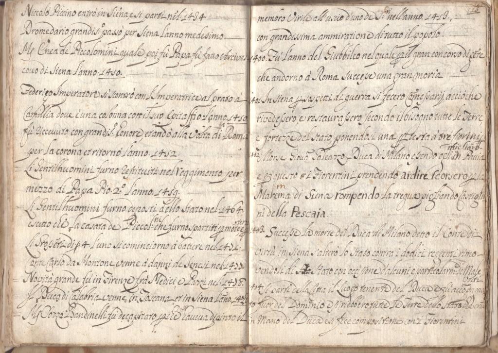 Il testo raccoglie notizie di grande interesse relative ai principali avvenimenti civili, architettonici e diplomatici della storia senese. Vi si ricordano, tra gli altri, l’edificazione della Porta Camollia, la posa dei mattoni del Duomo di Siena e la costruzione della celebre Torre del Mangia. Ampio spazio è inoltre riservato alle vicende politiche della Repubblica di Siena, comprese delicate fasi diplomatiche come la pace seguita alla Lega Italica del 1454.