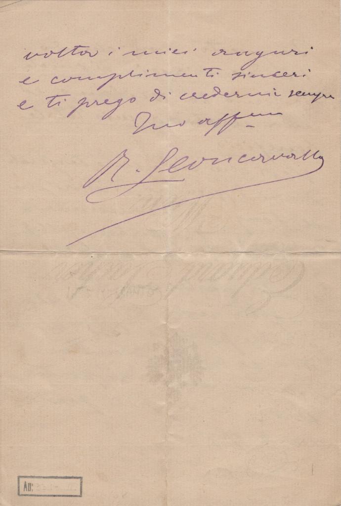 Lettera interamente autografa e firmata di Ruggero Leoncavallo celebre compositore e librettista, tra i maggiori esponenti del verismo operistico. La sua fama internazionale è legata soprattutto a Pagliacci (1892), uno dei titoli più eseguiti del repertorio lirico.