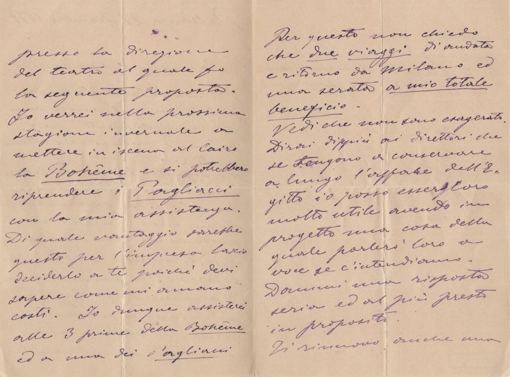 Splendida lettera redatta a Pallanza il 28 dicembre 1897 e indirizzata a un amico non identificato. Nella missiva l’autore di Pagliacci affronta il grande successo della sua opera più celebre e manifesta il desiderio di portarla in scena anche in Egitto, affiancandola alla sua Bohème. Con tono ironico e diretto, chiede di poter assistere personalmente alle prime tre rappresentazioni, richiedendo due viaggi di andata e ritorno da Milano e una serata “a mio totale beneficio. Vedi che non sono esagerato.”. Conclude pregando di essere informato in merito.