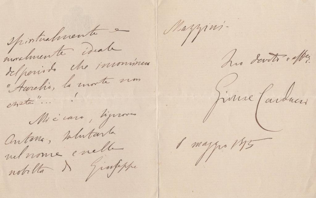 Documento che unisce storia del Risorgimento e letteratura italiana, mettendo in relazione tre protagonisti: Mazzini, Aurelio Saffi e Carducci. La citazione della lettera mazziniana per la morte della madre di Saffi aggiunge un nucleo umano e memoriale di forte impatto.