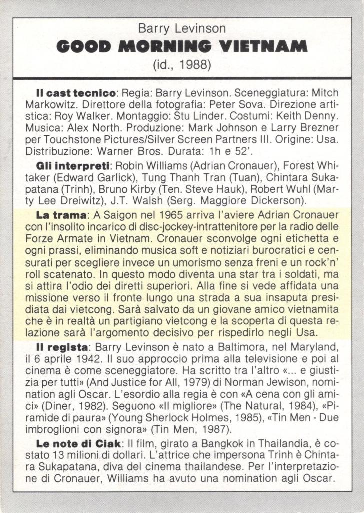 L’attore, protagonista indimenticabile nella parte del sergente radiofonico Adrian Cronauer, ottenne una nomination all’Oscar per questa interpretazione che unisce comicità travolgente e drammaticità legata al conflitto vietnamita.