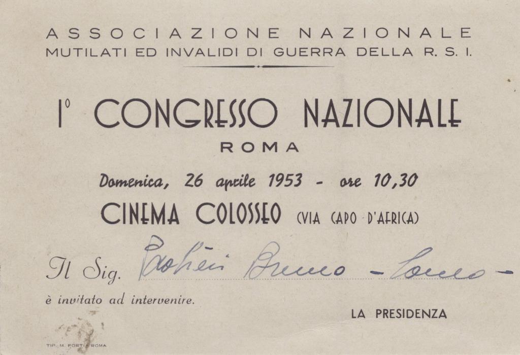 Interessante documento con autografo di Rodolfo Graziani su un invito ufficiale dell’Associazione Nazionale Mutilati ed Invalidi di Guerra della RSI indirizzato al Sig. Paolieri Bruno, riguarda il 1° Congresso Nazionale tenutosi a Roma il 26 aprile 1953.