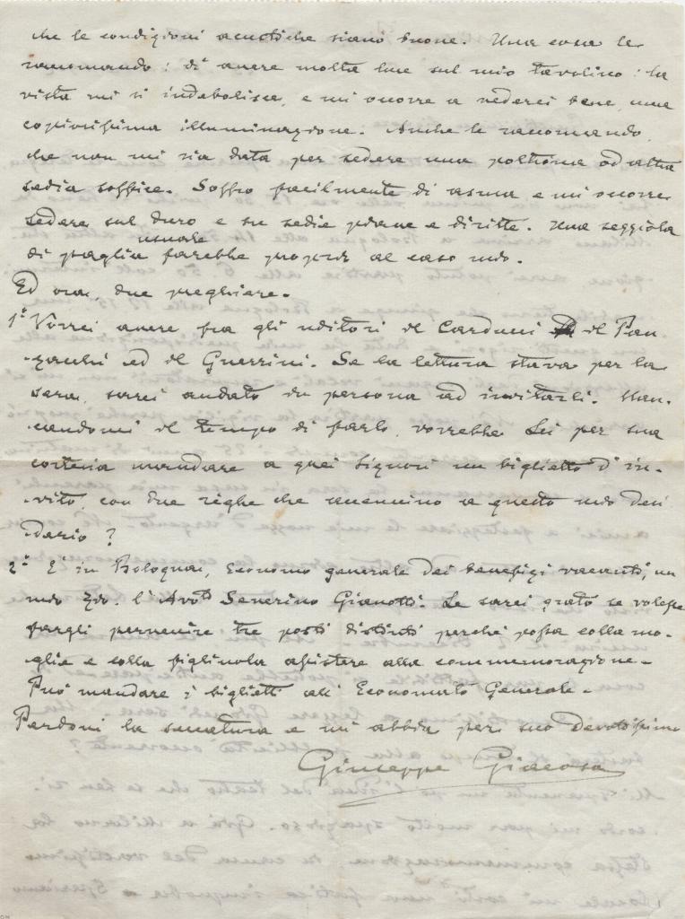 Giacosa conclude la lettera con due richieste pratiche, relative a incontri con editori e contatti bolognesi, ed esprime il desiderio di avere tra gli uditori Giosuè Carducci, Guerrini e l’avvocato Severino Gianotti con la moglie e la figlia, pregando il destinatario di inviare loro un biglietto d’invito per la commemorazione.