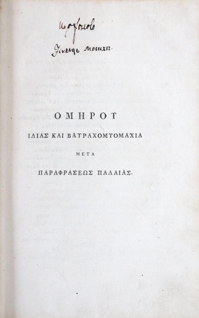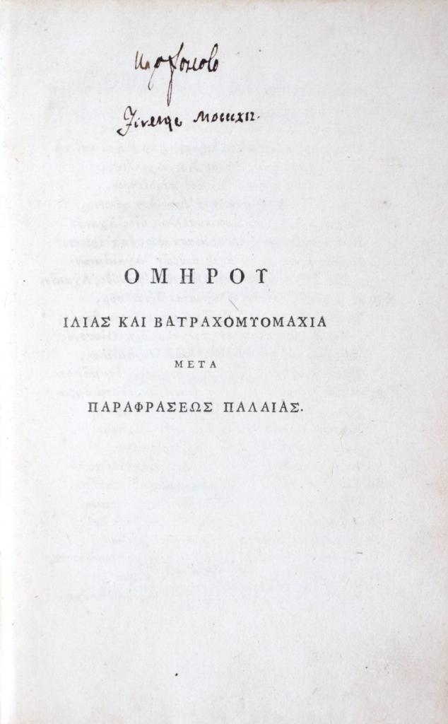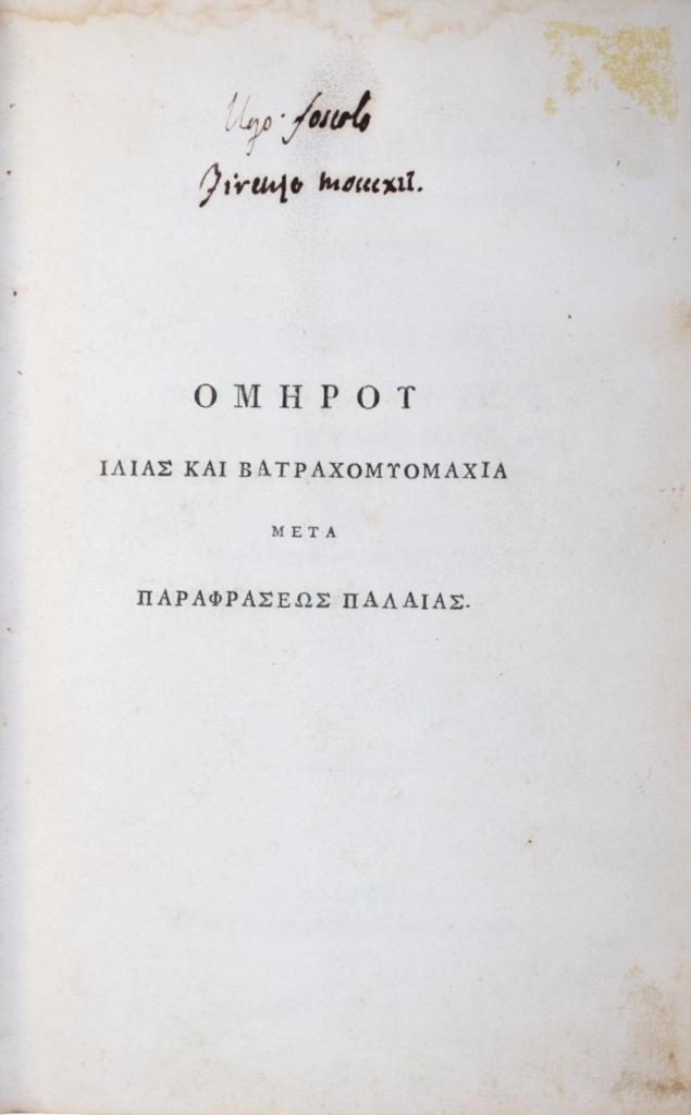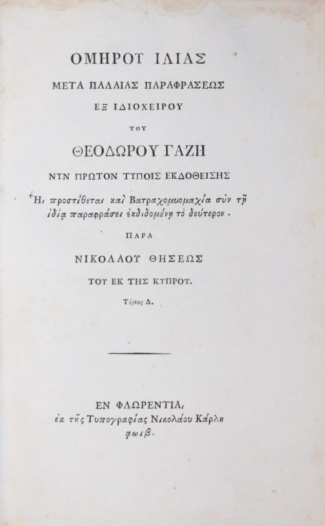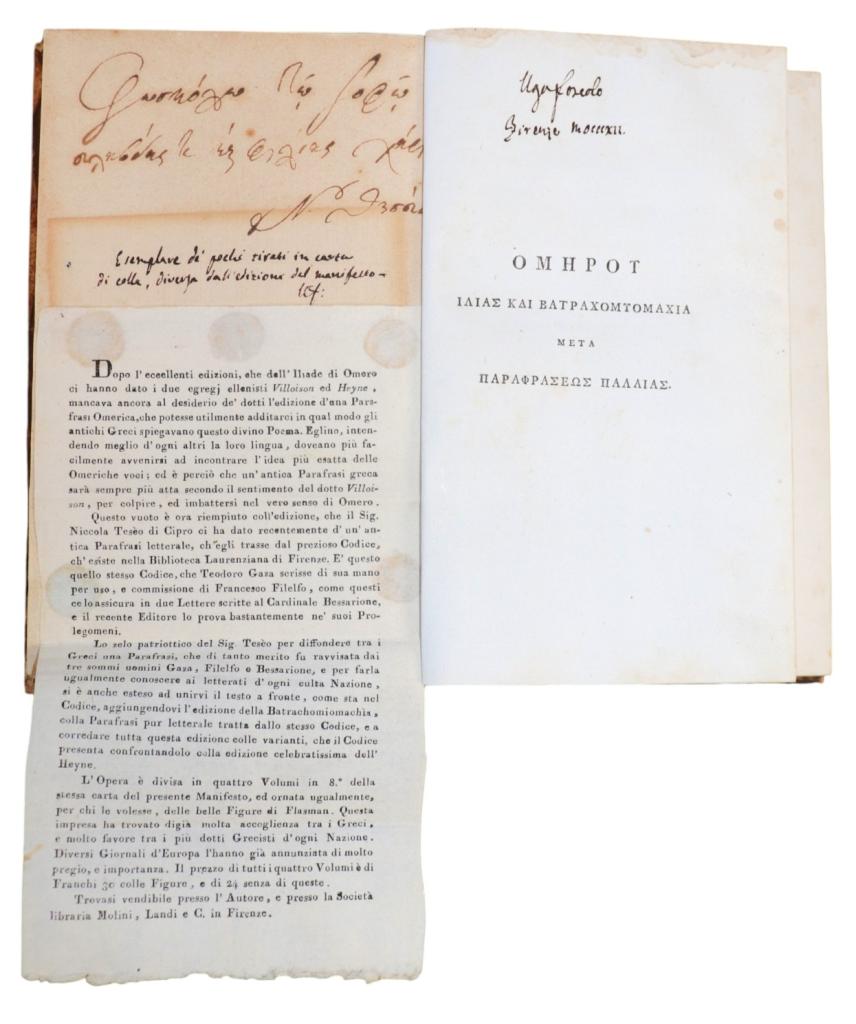Esemplare di assoluta rarità: i quattro frontespizi recano le firme autografe di Ugo Foscolo, apposte durante il suo soggiorno fiorentino (1812–1813), quando la città fu per il poeta laboratorio d’idee e relazioni con l’ambiente accademico e tipografico. L’opera, che unisce l’Iliade alla Batrachomyomachia (battaglia delle rane e dei topi, poemetto giocoso scritto da Omero per canzonare la Guerra di Troia), offre il testo con la parafrasi antica di Teodoro Gaza, progetto filologico curato da Niccolò Teseo di Cipro e accolto con favore dagli eruditi europei. Nel nostro esemplare spiccano due testimonianze manoscritte decisive: la postilla autografa di Foscolo sul foglio tipografico inserito nel vol. I — «Esemplare di pochi tirati in carta di colla, diversa dall’edizione del Manifesto» — che qualifica la copia come tiratura limitata su carta scelta, e la nota coeva dell’editore Niccolò Teseo (in greco, con sottoscrizione), ulteriore attestazione del carattere speciale e della provenienza d’officina.