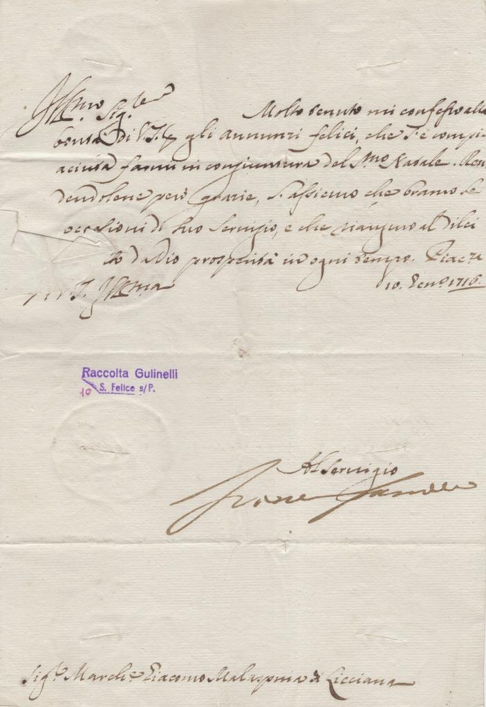 Lettera redatta a Piacenza il 10 gennaio 1716 e indirizzata al Marchese Giacomo Malaspina di Licciana.