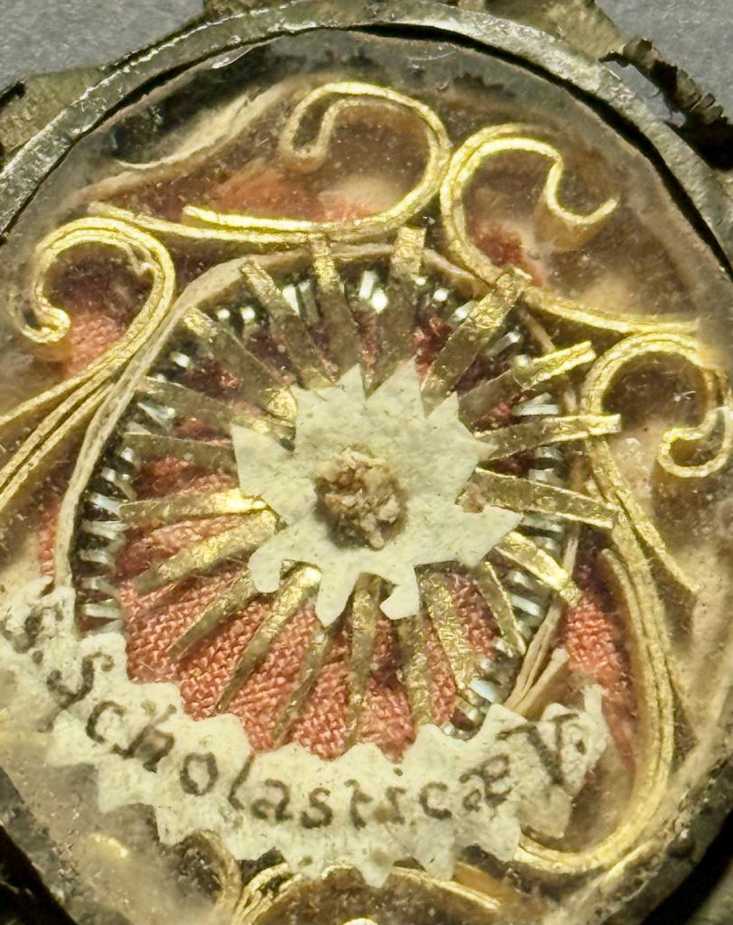 Suggestiva reliquia di Santa Scolastica da Norcia, racchiusa in piccola teca metallica circolare con bordo sagomato, vetro frontale e ricco apparato decorativo interno. Su fondo tessile rosso campeggia un sole raggiante in carta dorata al cui centro è fissata la particella reliquiaria, identificata dal cartiglio manoscritto “S. Scholasticae V.”.