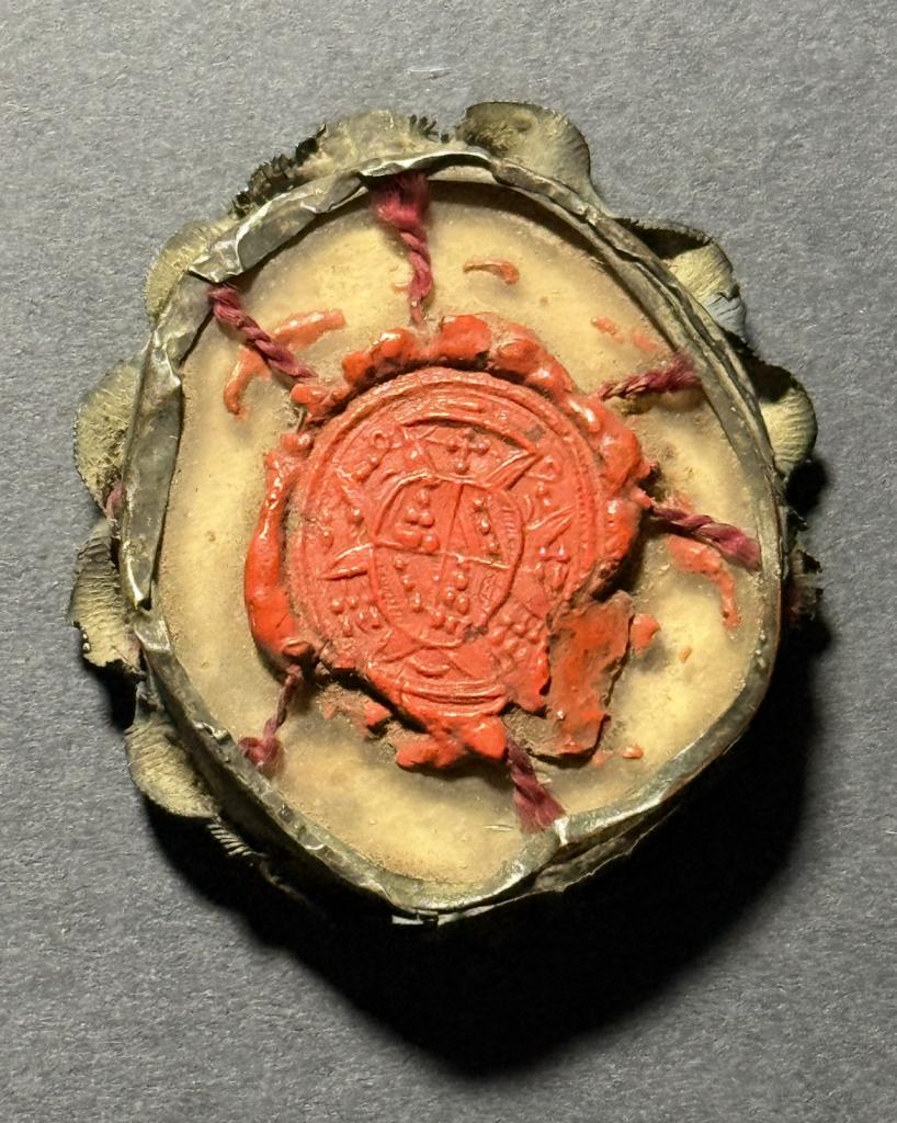 Il retro conserva l’originario sigillo in ceralacca rossa, impresso su massa cerosa chiara e attraversato da cordoncini di seta rossa, con stemma araldico ovale (verosimilmente vescovile) ancora ben leggibile. Si tratta di una tipica autentica ecclesiastica, attribuibile al XIX secolo.