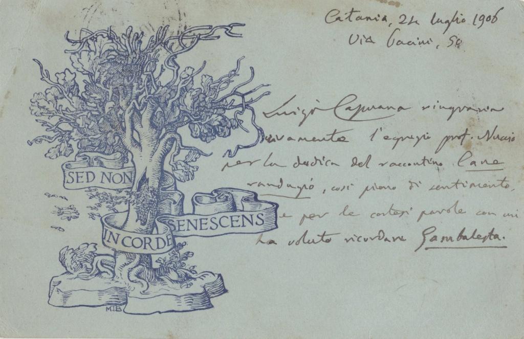 La cartolina, spedita da Catania il 24 luglio 1906, è indirizzata a Giuseppe Ernesto Nuccio, direttore del giornalino settimanale “Racconti della Domenica” di Palermo.
