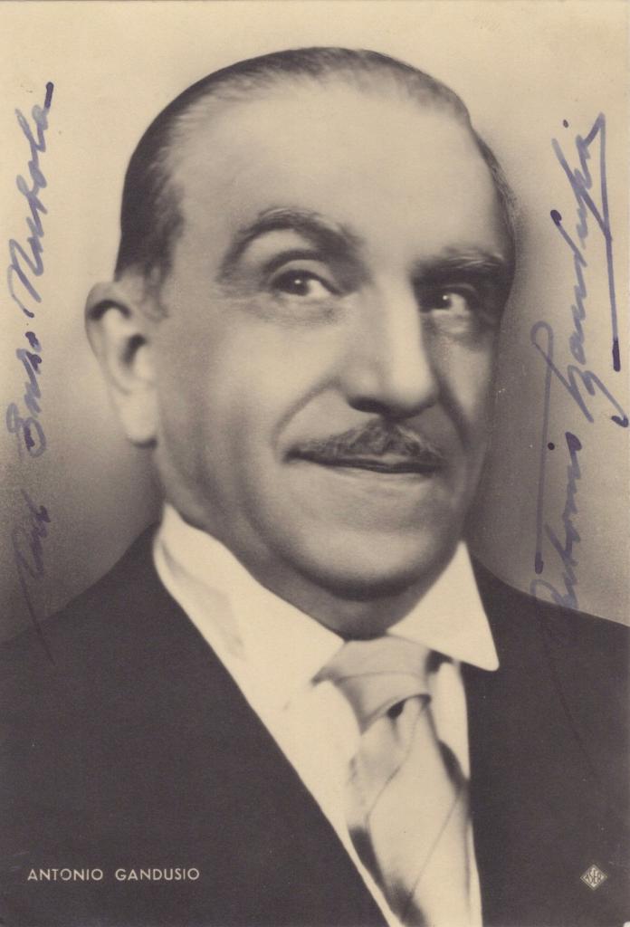 Fotografia con dedica interamente autografa e firmata di Antonio Gandusio, fu uno dei più raffinati interpreti del teatro leggero italiano. Amato per il suo stile brillante e per la naturale vena comica, passò con successo al cinema, recitando in numerosi film dagli anni ’30 ai primi ’50.