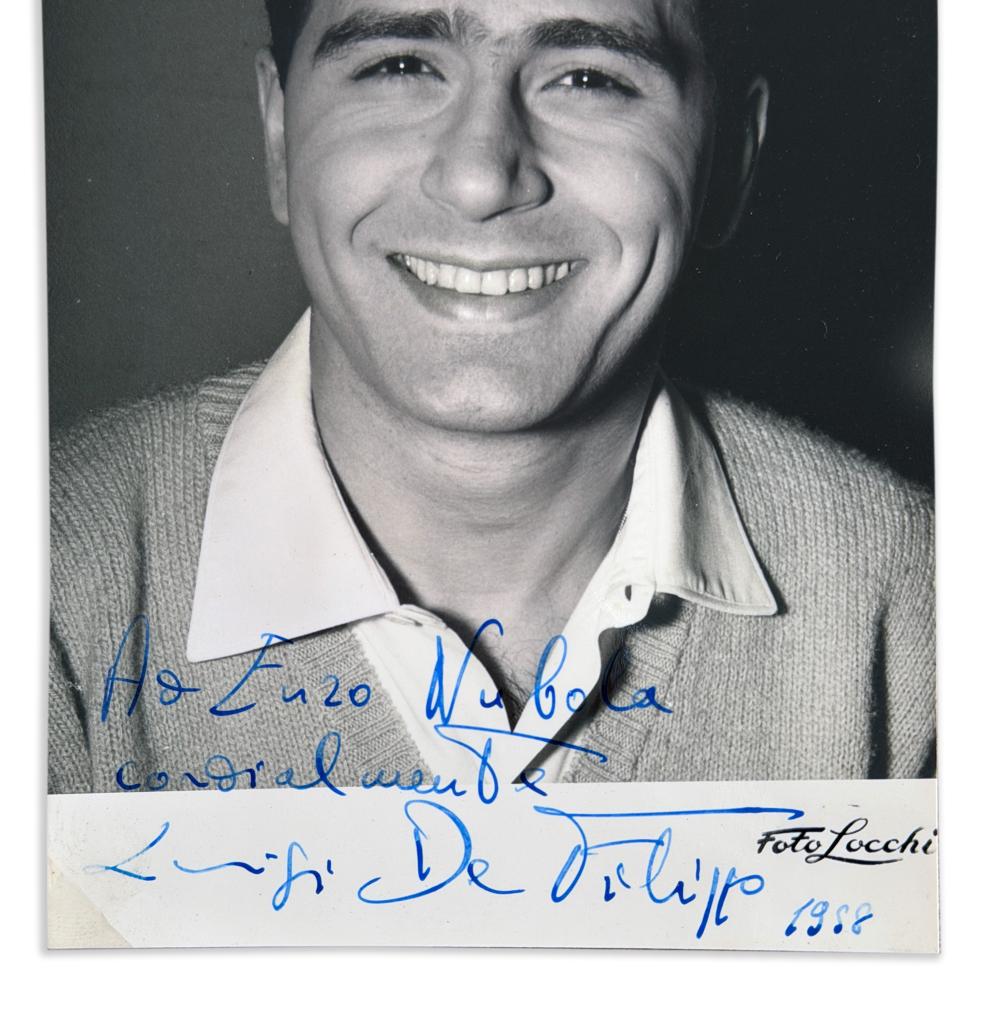 Fotografia con autografo di Luigi De Filippo in bianco e nero, datata 1958, raffigurante il giovane attore in primo piano, con espressione sorridente e naturale. L’immagine presenta una dedica manoscritta a Enzo Nubola, seguita dalla firma estesa dell’artista e dalla data. L’autografo è apposto a inchiostro blu sul margine inferiore della fotografia.